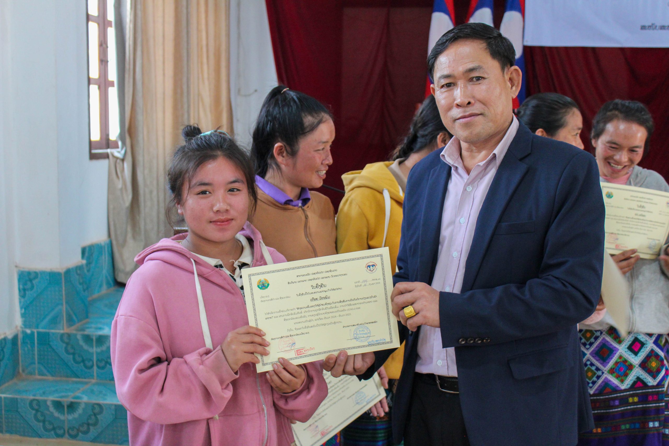 The meeting was honored to be presided over by Mr. Bounxuang Khamphouvong, Deputy Secretary of the District Party Committee and Chairman of the District Administration Committee, and Mr. Bountheung Sonvongxay, Director of the HJA. There were a total of 46 participants, including 33 women. The event also featured a certificate presentation ceremony for the volunteers.